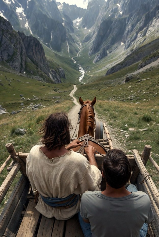 Then Jesus and I are sitting side by side in a buckboard being pulled by a horse, with Jesus handling the reins. At first I see us from above. I then see us from where I am sitting, and then behind as we are going down this path through a valley in the middle of the mountains. We then cross a stream. The horse stands on its hind legs as if frightened by something. I’m thinking there was something in the stream that scared it. Then just as suddenly, everything was normal. I then asked Jesus, “what was that all about?” Jesus responded, “That was just your imagination!”
