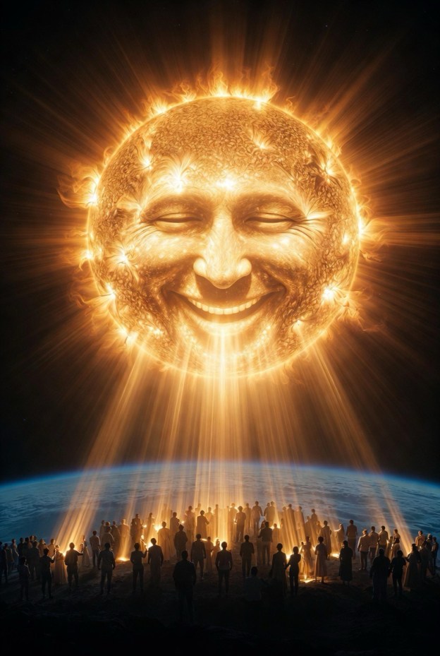 Then every person who was being touched by a ray of light held up one of their hands toward the Sun. When this happened a hand would come down from the sun and shake the hand of the person. This would happen over and over as the Sun passed over the earth.
